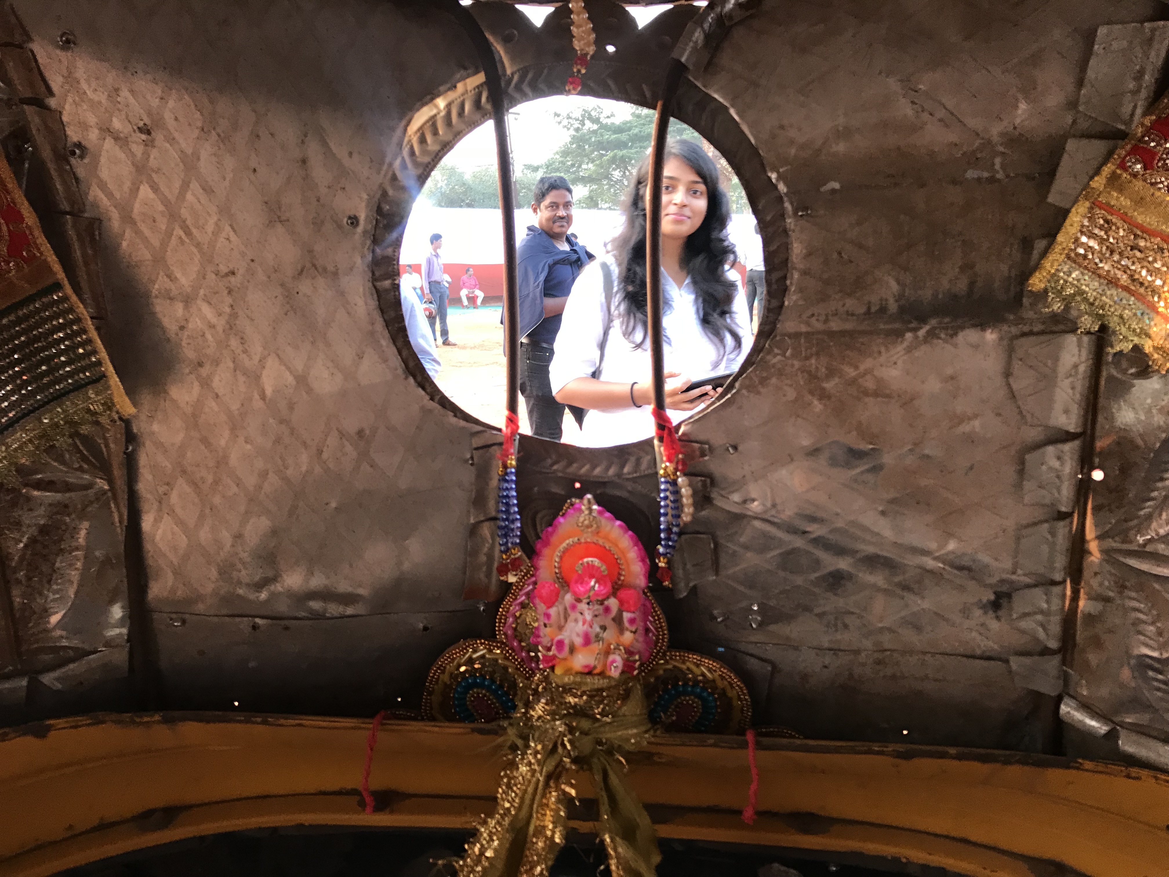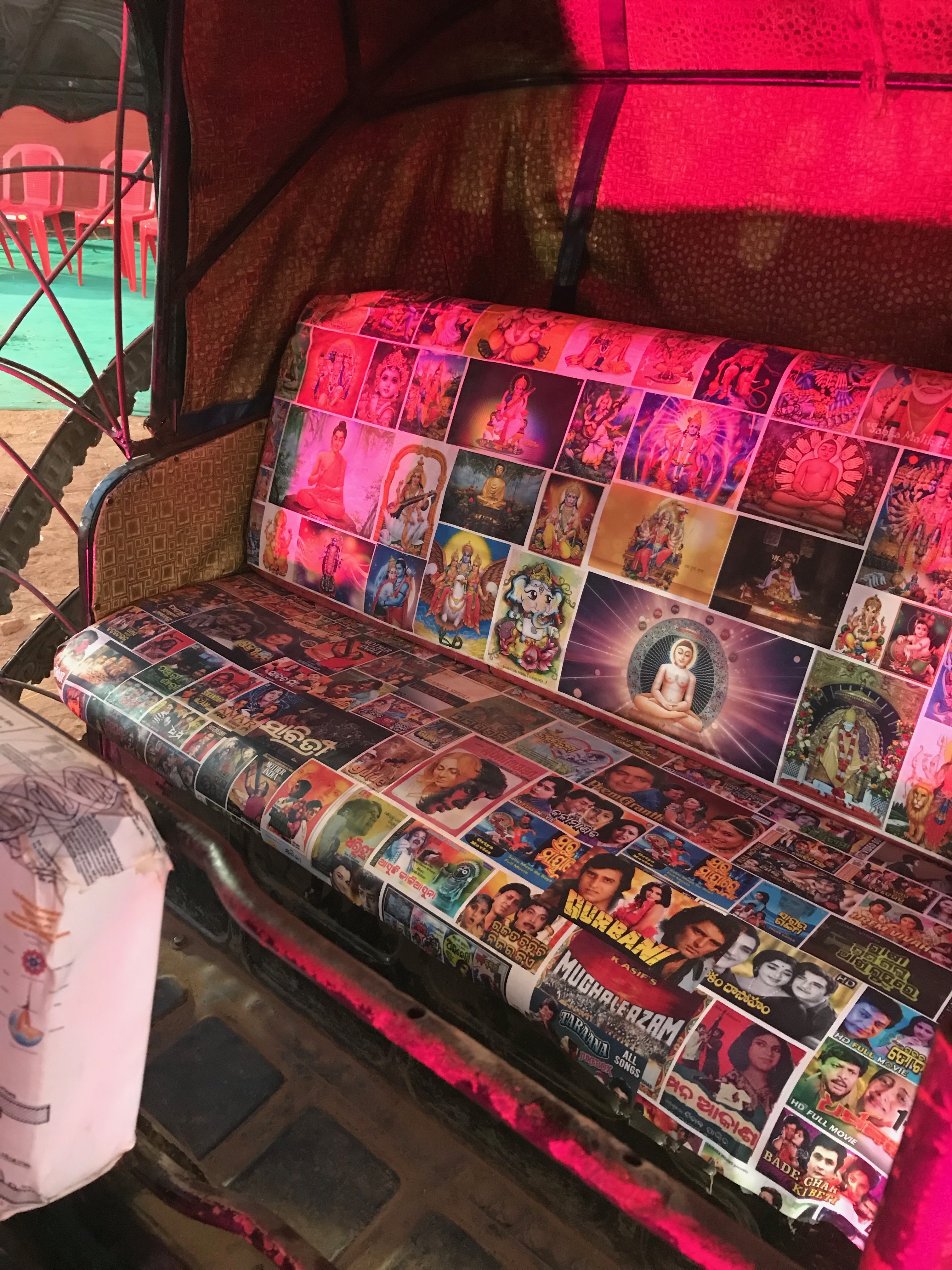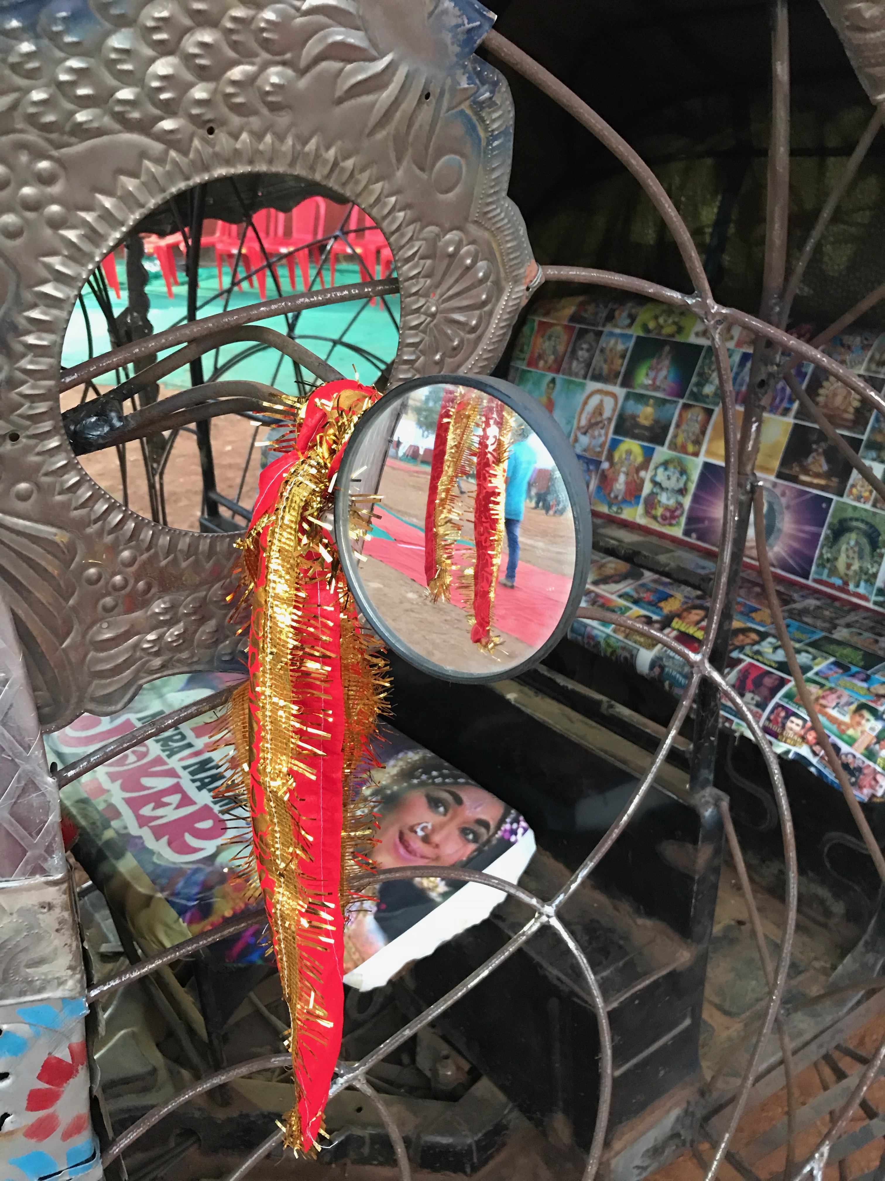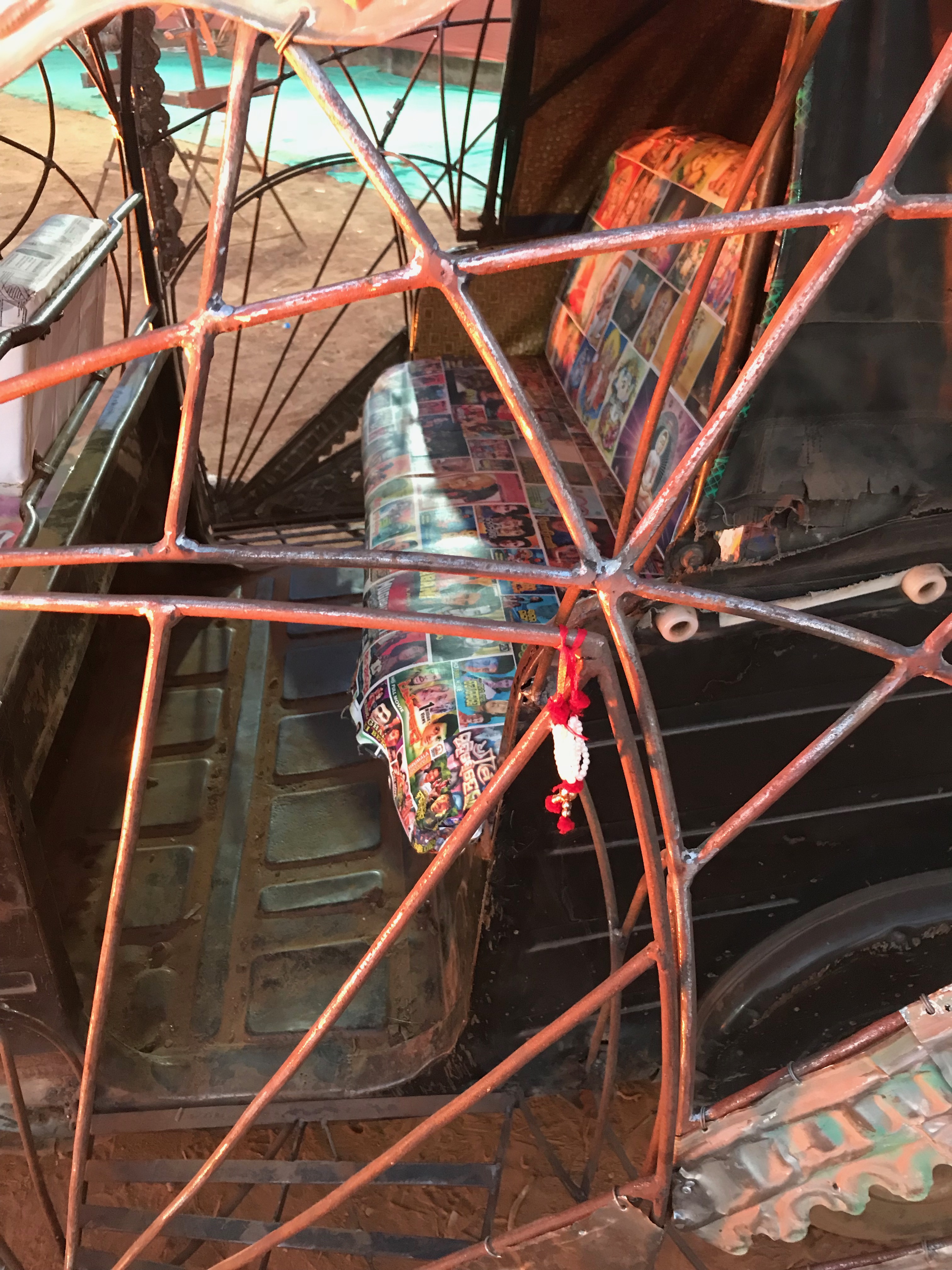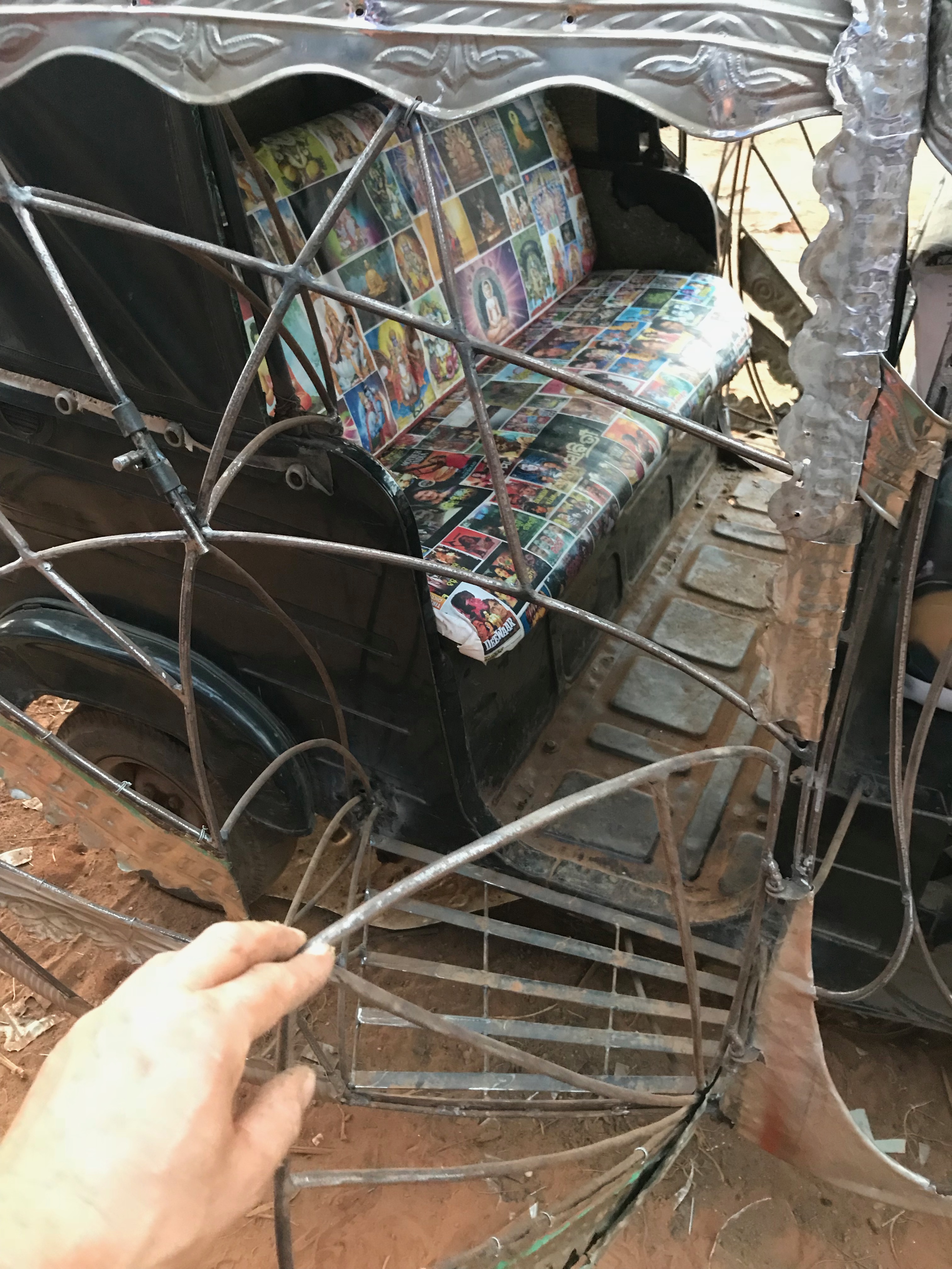 Working with a disused Auto-Rickshaw, and steel bar and scrap decorative panels of punched and painted aluminium of the kind found on buses and trucks across India I made a ‘Gobora Poko Auto’ (Auto-Rickshaw Dung Beetle). I took as my inspiration the lowly dung beetle – a humble but beautiful creature with an amazing sculptural form to its powerful shell and a vital part to play in the natural ecosystem. Building this around the Auto Rickshaw (movable but with no engine) a humble vehicle with a similarly vital role in the city’s ecosystem, I made a new type of creature with a playful exterior and interior, celebrating the exuberant Odishan love of decoration and pattern, and celebrating both the rich tradition of intricate craft skills and huge collaborative effort to recycle that I saw everywhere I looked in Bhubeneswar.